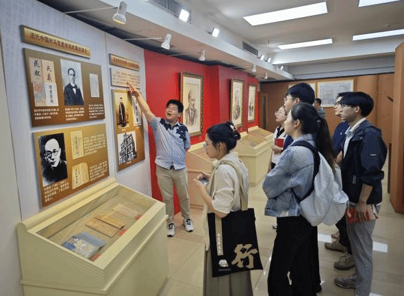 在北大红楼这座曾是五四运动重要策源地、北京共产党早期组织诞生地的纪念馆(中国共产党早期北京革命活动纪念馆),研学师生参观了蔡元培就任北大校长的任命状、提出“兼并包容”思想的手稿,陈独秀、胡适等人的白话诗稿,李大钊、鲁迅等人的信件,毛泽东工作过的阅览室等展陈,专题性学习了中国共产党创建前后的北京革命活动以及马克思主义在中国早期传播的历史。