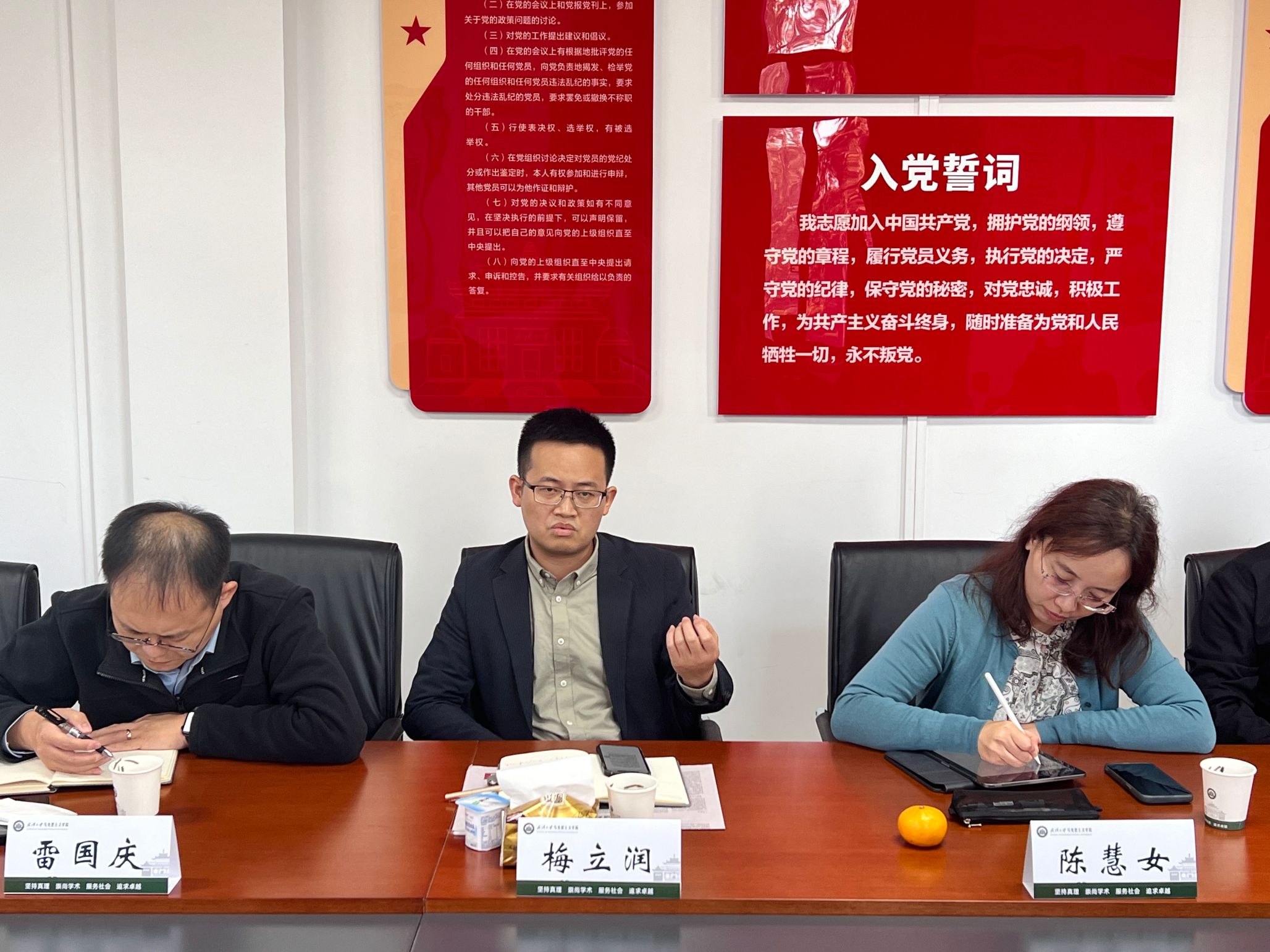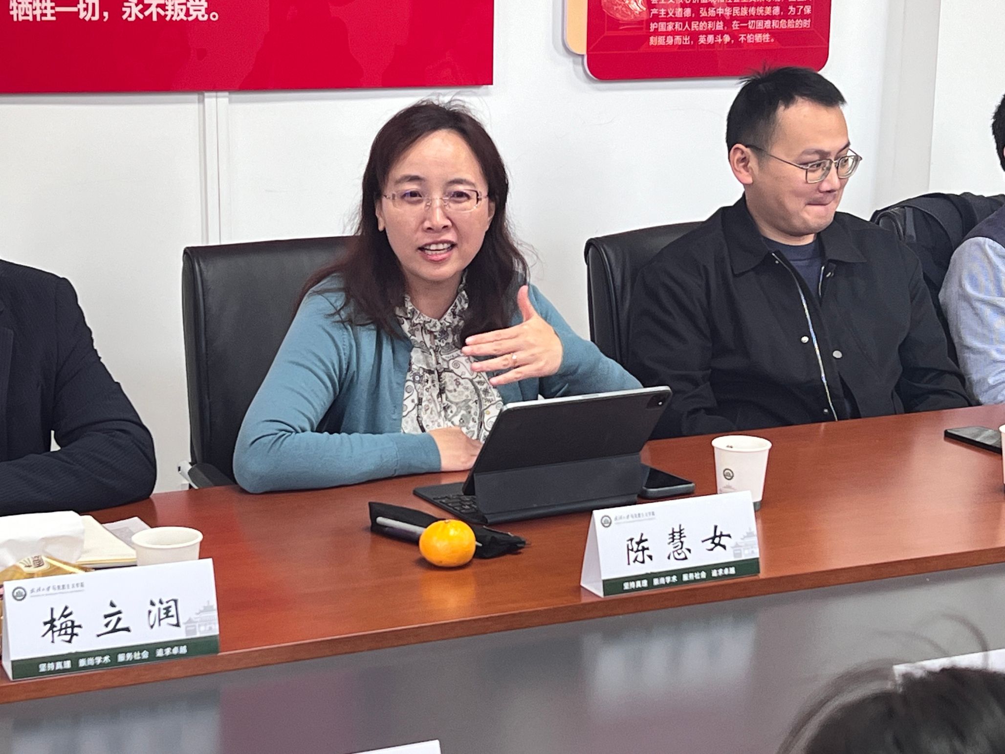 梅立润向与会人员汇报了本学年课程教学过程中发现的新问题和新情况,并基于提升思政课体验感和获得感介绍了联合信息与管理学院、水利水电学院开展研究生思政课教学改革的主要做法。本学年梅立润、付玉璋、卢丽珠、赵烨旸等老师组成教研团队,基于“贴近专业的内容设计”和“发挥专业的服务功能”的设计思路,引导信息与管理学院课堂开展政治文本深度挖掘实践活动,联合水利水电学院专业课教师开展“治水”主题讨论活动和实践调研活动,实现“专业+思政”的结合,并引导学生学以致用,发挥专业的社会服务功能,以提升研究生思政课的体验感与获得感。