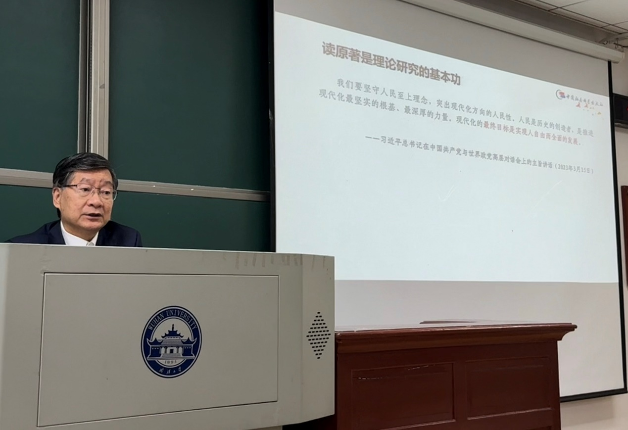 赵剑英教授首先强调了熟读原著在理论研究中的基础性作用。他指出,研读马克思主义经典著作、马克思主义中国化史以及习近平新时代中国特色社会主义思想的原著,是把握科学思想方法体系的关键。他特别提及习近平总书记对《〈政治经济学批判〉序言》《关于费尔巴哈的提纲》《共产党宣言》等经典文本的深入研读和阐发,并鼓励学生系统学习《在文化传承发展座谈会上的讲话》《习近平著作选读》《习近平谈治国理政》《习近平文化思想学习纲要》等重要文献,从整体上把握习近平文化思想的体系结构与理论内涵。