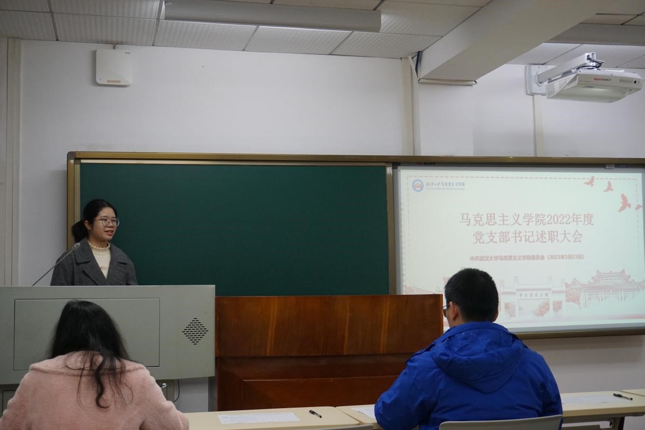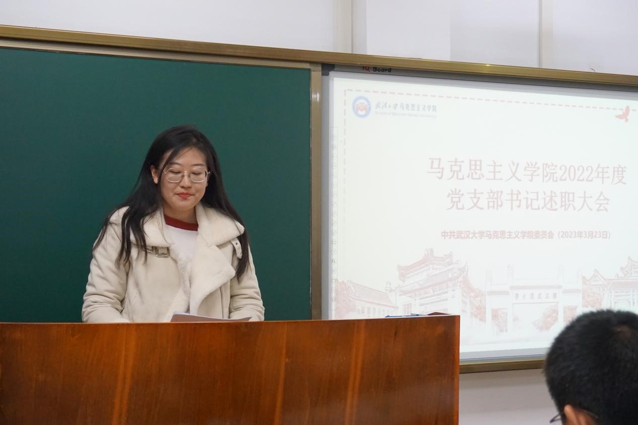 2022级博士研究生第二党支部书记杨檬从思想政治理论建设、支委负责制互助关系网建立、发挥马理论学科优势、积极开展党日活动等方面进行述职。在支部成员的共同努力之下,支部作为样板党支部,代表学院首发录制杏吧原创