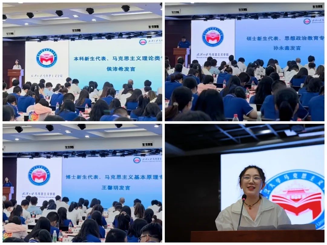 在学生代表发言环节,2022级本科新生代表侯沛希同学谈到了结缘武大、选择武大的原因,表达了对大学四年生活的美好畅想,号召同学们以参与者的姿态找到属于自己的归属感。2022级硕士新生代表孙永鑫同学分享了自己学习马克思主义理论的契机以及在追逐马克思主义的道路中的相关经历,倡导同学们要有坚如磐石的政治定力、源源不竭的学习动力、敢为人先的实践魄力、率先垂范的人格魅力,在学思践悟中争做新时代武大青年!2022级博士新生代表王馨玥同学讲到,在未来的学习生活中,应珍惜时光,格物致知,坚定理想,不负时代,热爱生活,乐观向上,以青春之我,回应当下蓬勃美好的时代。高年级学生代表,思想政治教育专业博士研究生付玉璋同学与学弟学妹们分享四点感悟:一是学在武大,要尊师重道,从游于师,治学严谨,学风端正,博观约取,厚积薄发。二是干在武大,不仅要读有字之书,更要读无字之书,在实践中不断磨砺与成长。三是乐在武大,保持乐观精神,以辩证的态度看待荆棘,在挫折中看到希望,在黑暗中看到光明,在危机中看到转机。四是爱在武大,珍惜来自五湖四海的缘分,收获宝贵的师生情和同窗情。