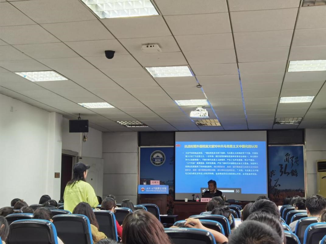 接下来,学生们踊跃发言提问,胡德坤教授也一一耐心作了回答。他表明自己是研究世界史出身,尤其专注二战时期中国的抗战史。抗日战争的胜利是中国复兴的起点,应当重视对抗战史的系统学科建设。想要研究一门学科,须有世界视野,有大历史观,要用世界的眼光看中国,来研究中国在世界历史中的地位、作用,来研究中国共产党。自己和团队在世界各地收集资料的过程中,越来越发现中国共产党在二战时已有相当的存在感,因此他鼓励大家开拓视野,从更广阔的角度展开马学科研究。