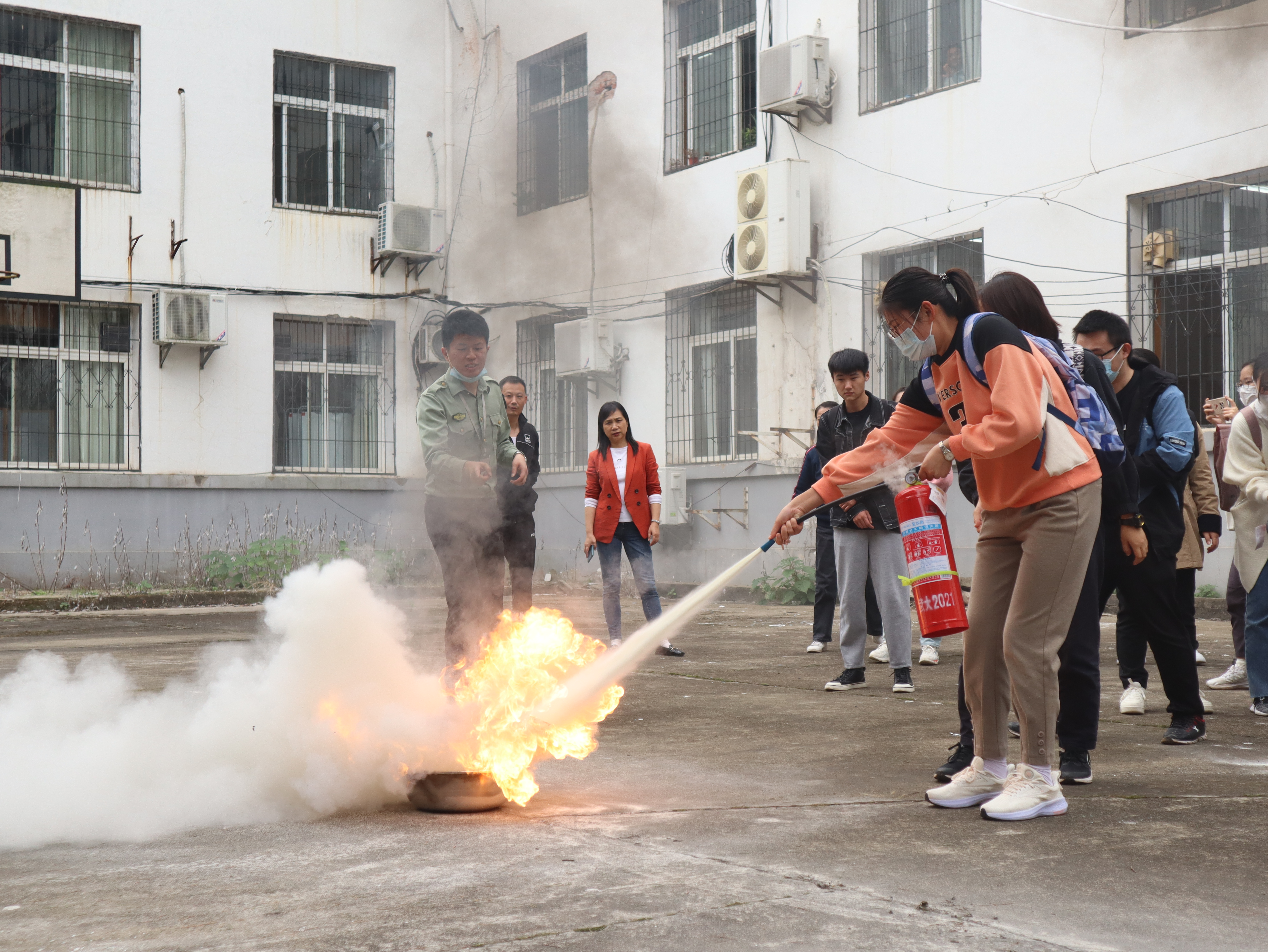 最后,廖教官以实战为背景,引燃烟雾弹,组织大家进行消防演习和灭火器实操演练,让大家在情景模拟中切实提升消防应急能力,深化对消防知识的认知。