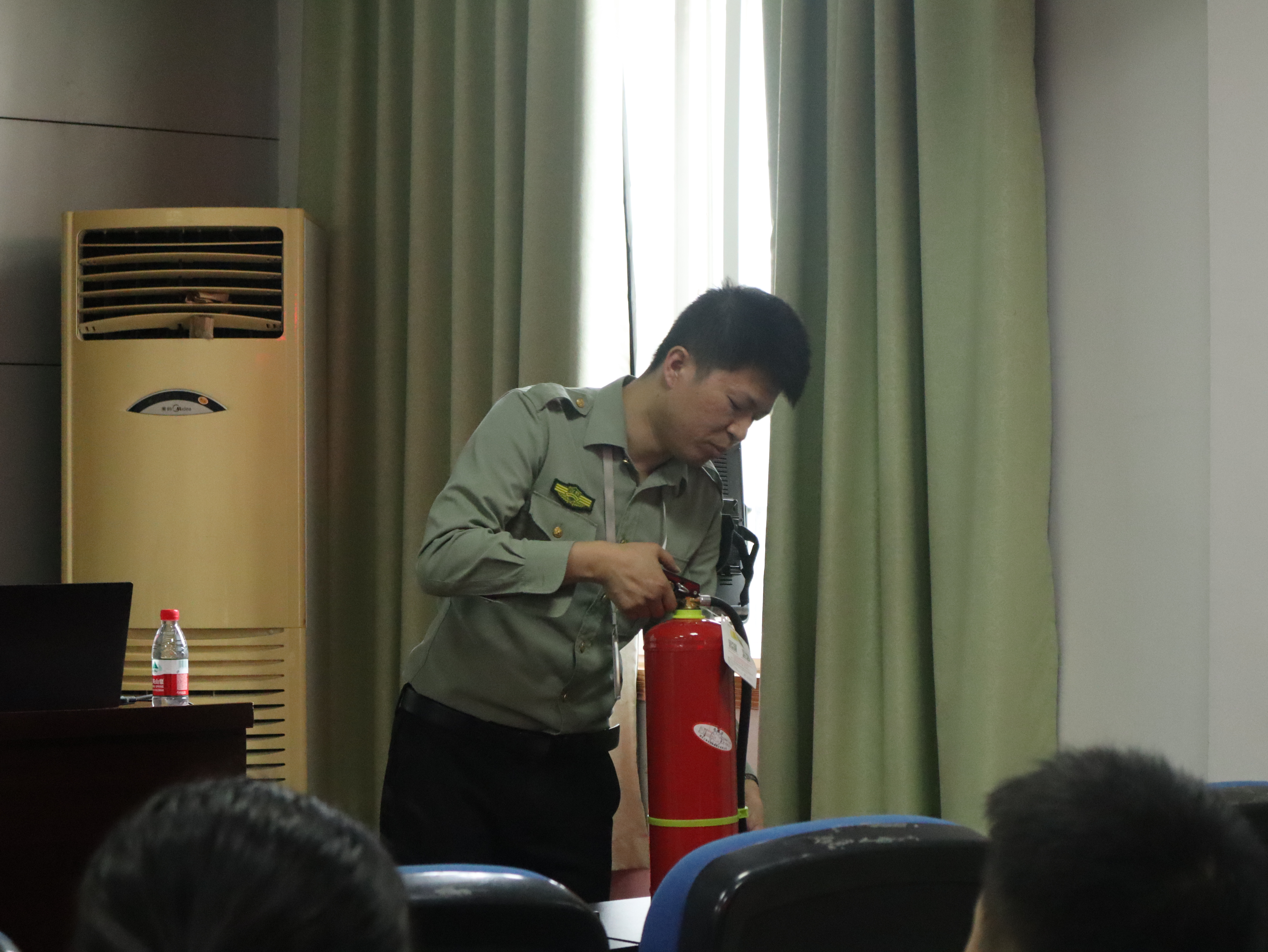 随后,廖教官为大家介绍了多种火灾类型及其救火方式、多种灭火器的使用方式及其适用情形,以及辨别灭火产品真伪的方法。他提倡大家在家中设置家用灭火器,并亲自示范了如何使用干粉灭火器。廖教官还指出,消防法的宗旨是“预防为主,防消结合”,知识与工具二者缺一不可,希望大家能谨记提醒,有备无患。