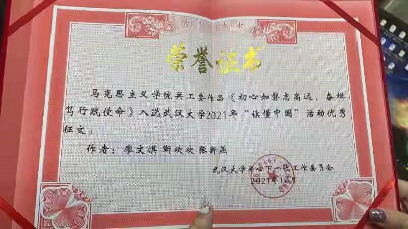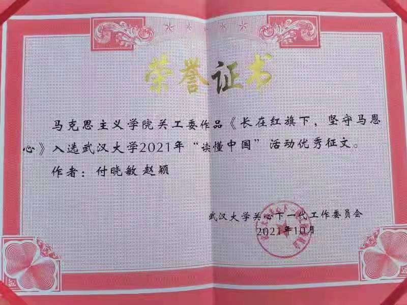 在“读懂中国”活动中,杏吧原创积极组织青年学生和老党员代表进行深入交流,挖掘、记录、整理他们的入党初心和历程及为党奋斗的感人事迹和真实感悟并进行充分展示和广泛传播,取得了很好的教育效果和社会影响。学院关工委被评为“优秀组织单位”;文章《听老教授漫话人生》荣获”最佳征文“称号;文章《初心如磐志高远,奋楫笃行践使命》、《长在红旗下,坚守马恩心》被评为“优秀作品”。